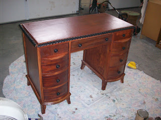 My first project of the summer was refinishing an old desk that used to be Brett’s grandpa Lamar’s. It had been sitting in our house on the back porch for a year collecting dust and I vowed that it would be the first thing that I would do as soon as I had free time. And free time I did have… I was also going to take some pictures of the before and after of the desk but I got too excited about refinishing it and before I remembered I was almost done…. So all you get is that after pictures. You’ll just have to trust me that I really did it. I can tell you that it did all used to be one color and now it’s 2!